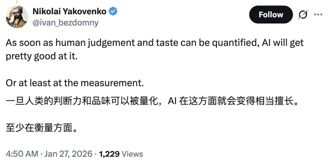 只要判断力和品味可以被量化,AI就会瞬间秒杀人类。或者更残忍点——它会重新定义什么是「好品味」。
