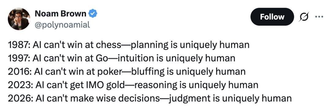 Noam Brown这份清单,就是一份无情的「人类祛魅指南」。它一层层剥掉人类的特殊性,直到今天,剥到了内核——决策权。