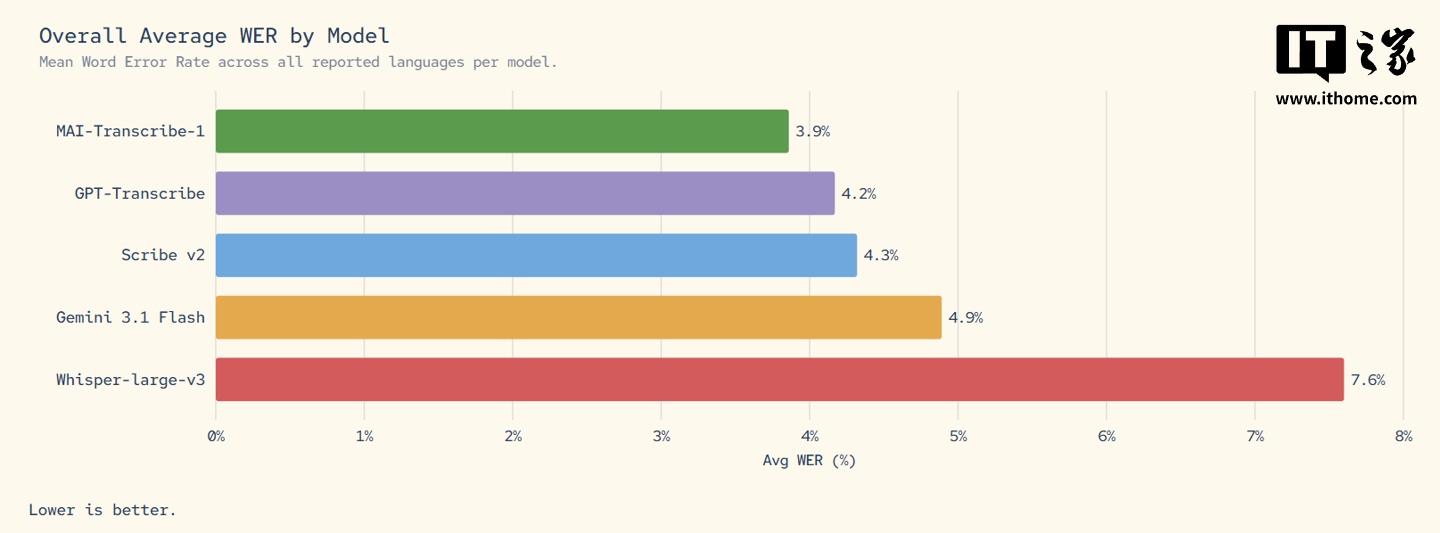 IT之家 4 月 3 日消息,微软昨日(4 月 2 日)发布公告,持续扩充自研 AI 模型版图,继 MAI-Voice-1 和 MAI-Image-2 之后,推出第三款自研模型 MAI-Transcribe-1,以 3.9% 的字错误率号称全球最精准转录模型。