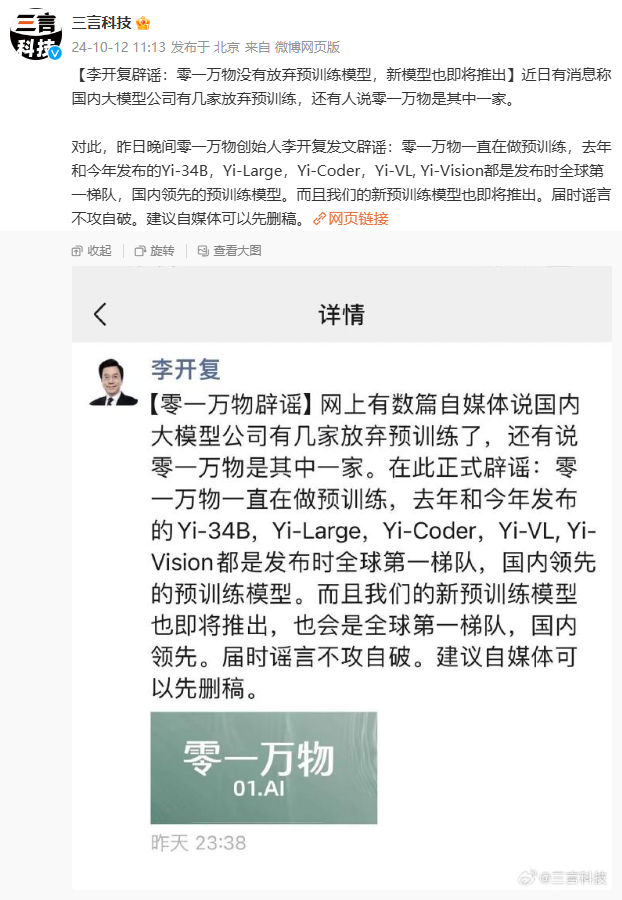 李开复回应称:“零一万物一直在做预训练,去年和今年发布的 Yi-34B,Yi-Large,Yi-Coder,Yi-VL,YiVision 都是发布时全球第一梯队,国内领先的预训练模型。而且我们的新预训练模型也即将推出,也会是全球第一梯队,国内领先。届时谣言不攻自破。建议自媒体可以先删稿。”