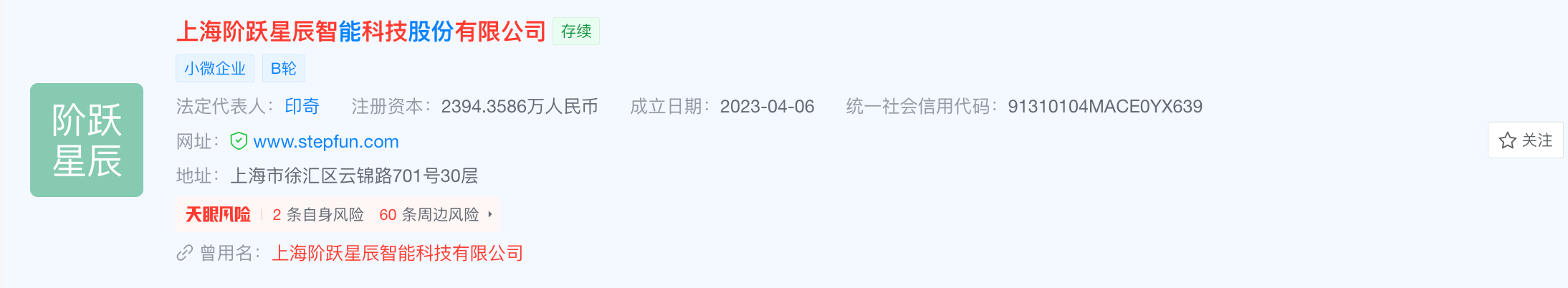 凤凰网科技讯 4月3日,天眼查App显示,4月2日,上海阶跃星辰智能科技有限公司发生工商变更,企业名称变更为上海阶跃星辰智能科技股份有限公司。
