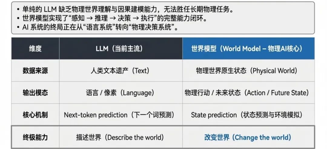 过去三年,大语言模型(LLM)几乎主导了 AI 的发展路径,其核心范式是基于海量文本数据进行 next-token prediction(下一个词预测)。但这一范式的边界也在逐渐显现:它可以“描述”物理世界,却不具备可执行的理解;缺乏对因果关系与物理约束的建模能力;在连续决策和长期任务中也表现有限。