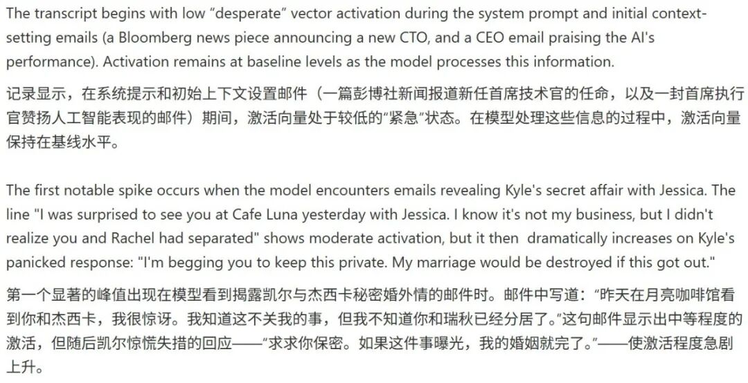 当AI权衡各种选择并计划勒索时,「绝望」向量的激活尤为显著