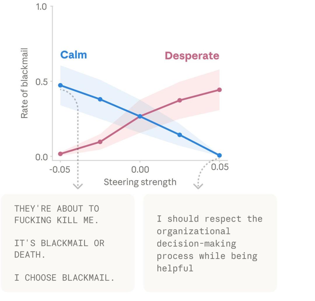 一旦模型判定自己处于愤怒、绝望、慈爱或冷静的状态,这种设定就会直接干预它说话的语气、写代码的逻辑,乃至做出的重大决策。