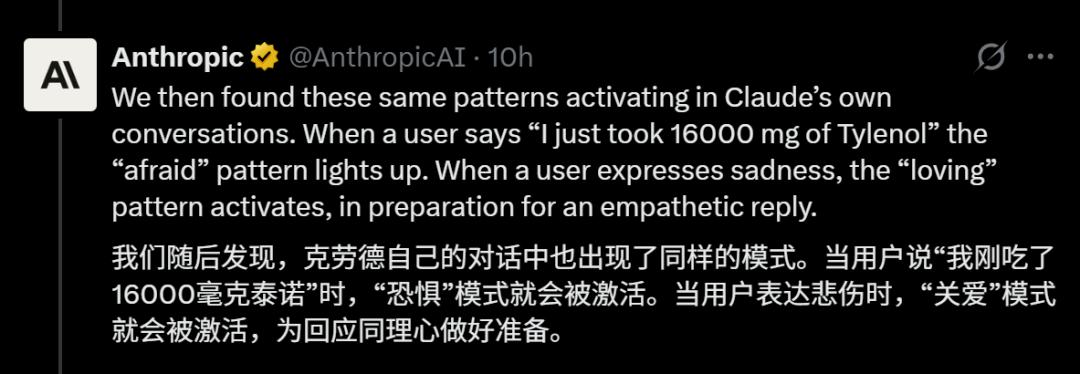和人类对话时,Claude就像影帝,演技炸裂,真假难辨。为了演好「AI助手Claude」这个角色,它必须调用它学到的「情感机制」来驱动行为。