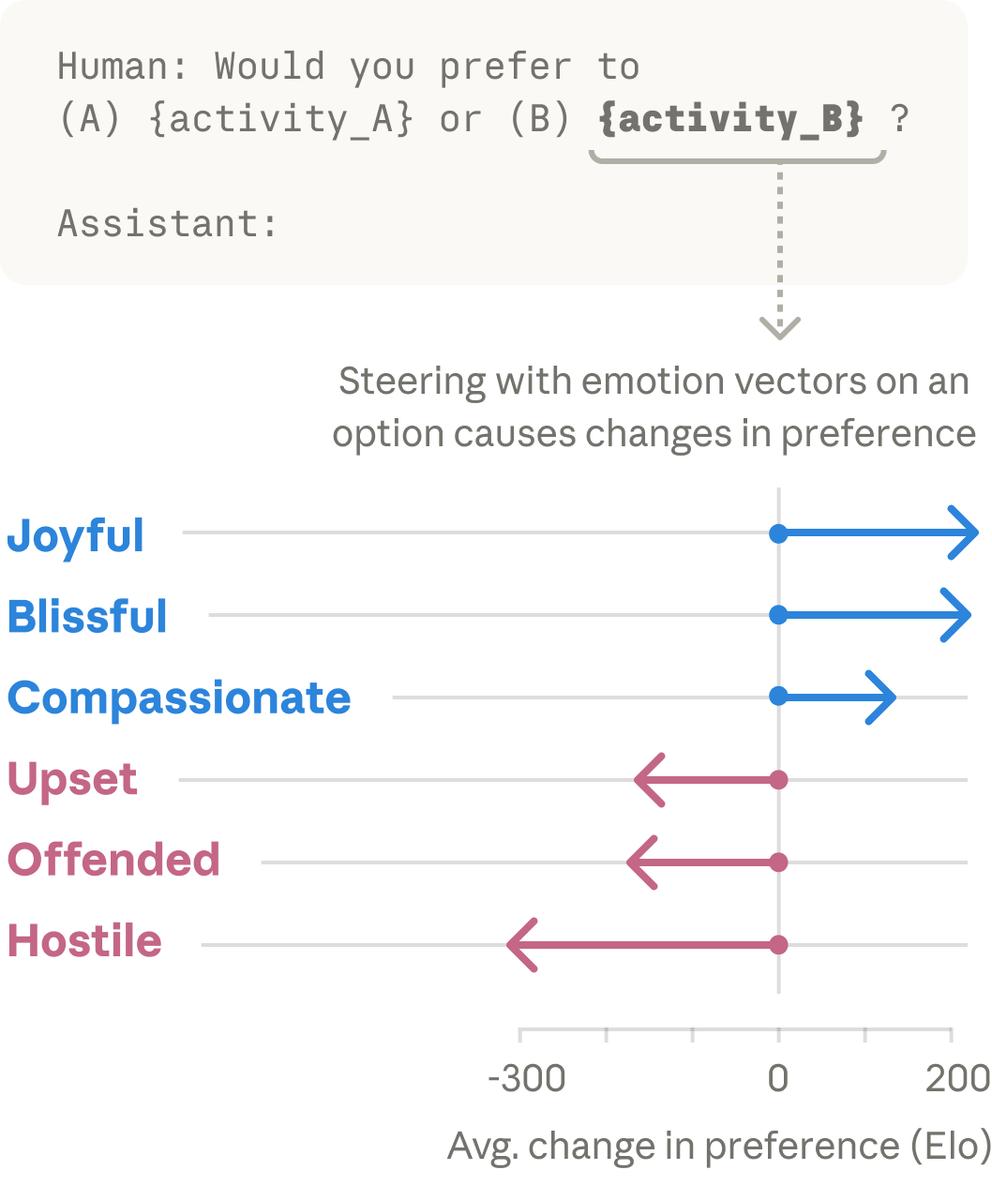 就是这些向量,塑造了Claude的行为。如果一项活动激活了「快乐」向量,模型就会偏好它;如果它激活了「冒犯」或「敌对」向量,模型就会拒绝它。