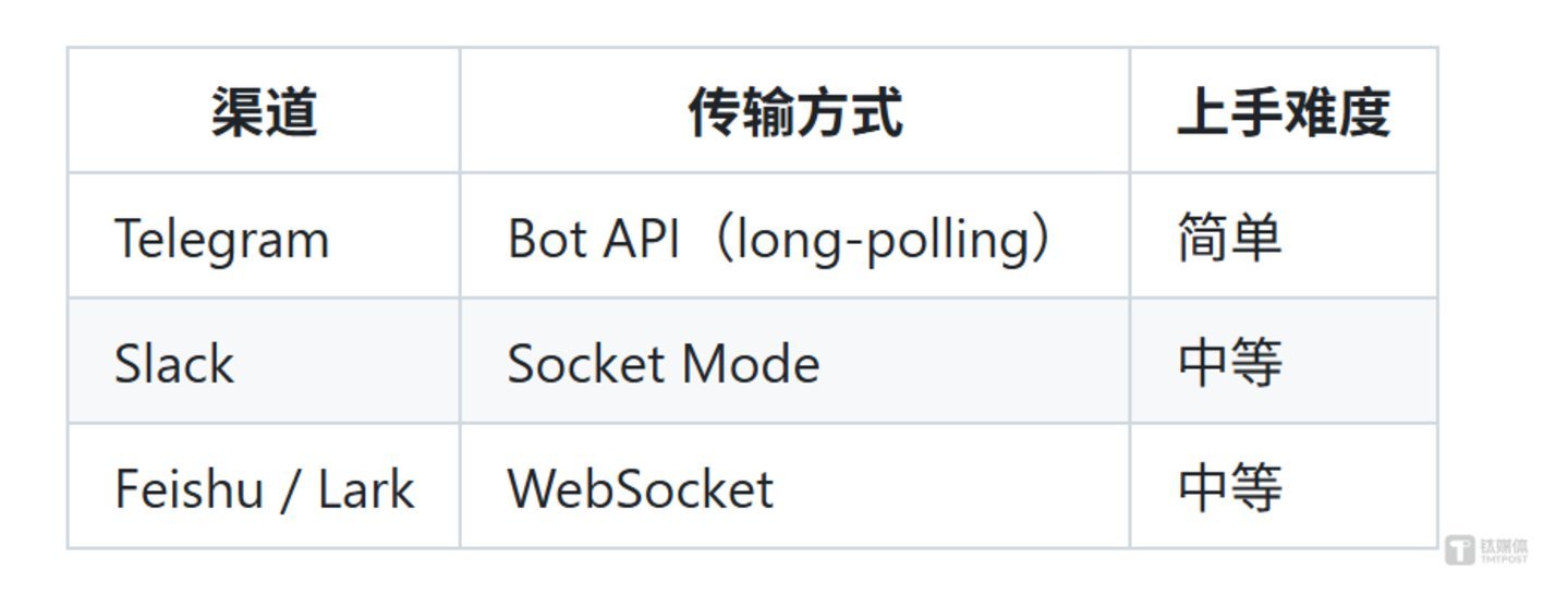 4、消息网关:保障各个功能模块之间顺畅沟通,避免出现“各自为政”的情况,同时内置支持Telegram、Slack、飞书等即时通讯渠道,适配更多使用场景。