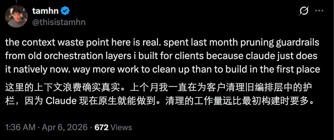 另一位开发者则用自身经历印证了这一点:他上个月花了大量时间清理为客户搭建的旧编排层里的冗余逻辑,「清理烂摊子,比当初搭的时候费力多了」。