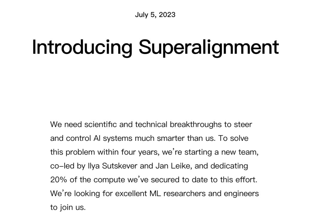 当时在博客文章中,OpenAI 宣称将会投入公司 20% 的算力去做这方面的工作,由 Sutskever 和 Jan Leike 等人主导。