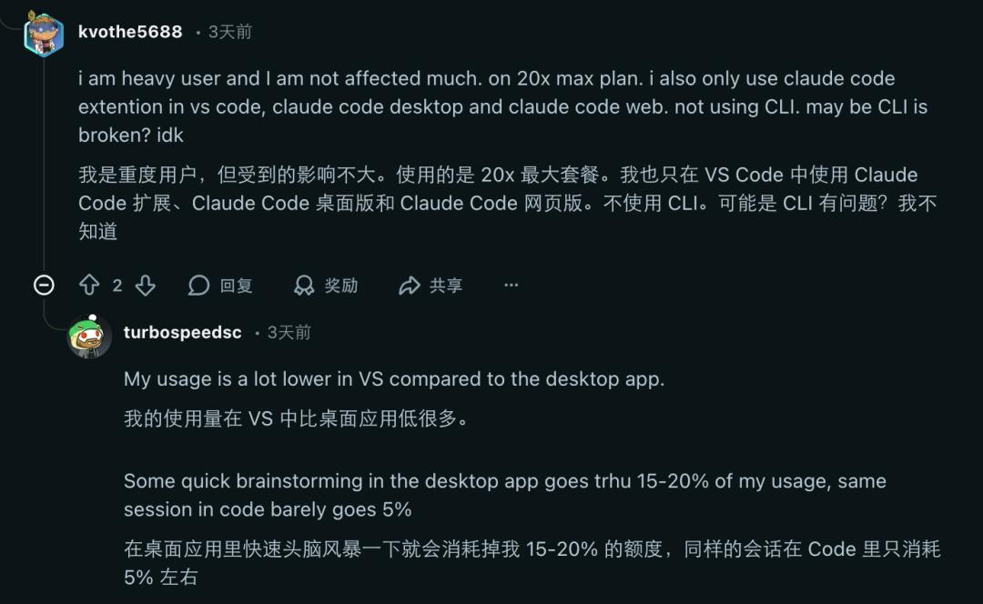 经过大家在评论区的比对发现,这些不受影响的用户基本都是在用 VS Code 插件、电脑桌面版或直接用网页版。这进一步印证了一个结论:这个吞额度 Bug 几乎是 Claude Code CLI 原生安装包专属的灾难。