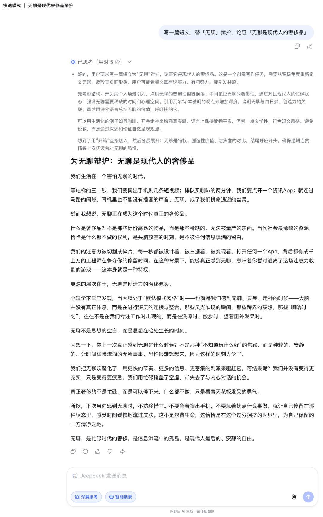 创意写作方面,我给两种模式出了一道辩论写作题,题目是「替无聊辩护,论证无聊是现代人的奢侈品」。