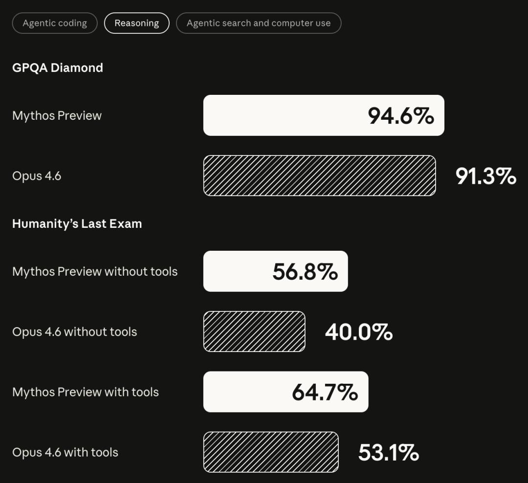 Humanity's Last Exam(带工具):Mythos 64.7%,Opus 4.6 53.1%
