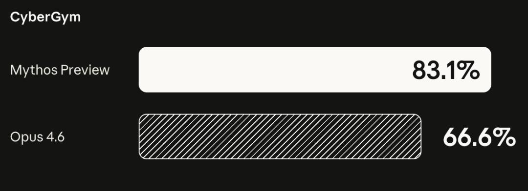 这句话翻译一下,只剩极少数顶级安全专家,还能在这件事上打赢 AI。验证这个说法的,是 Mythos Preview 在 CyberGym 安全漏洞基准上的成绩:83.1%。Anthropic 目前公开发布的最强模型 Claude Opus 4.6,是 66.6%。