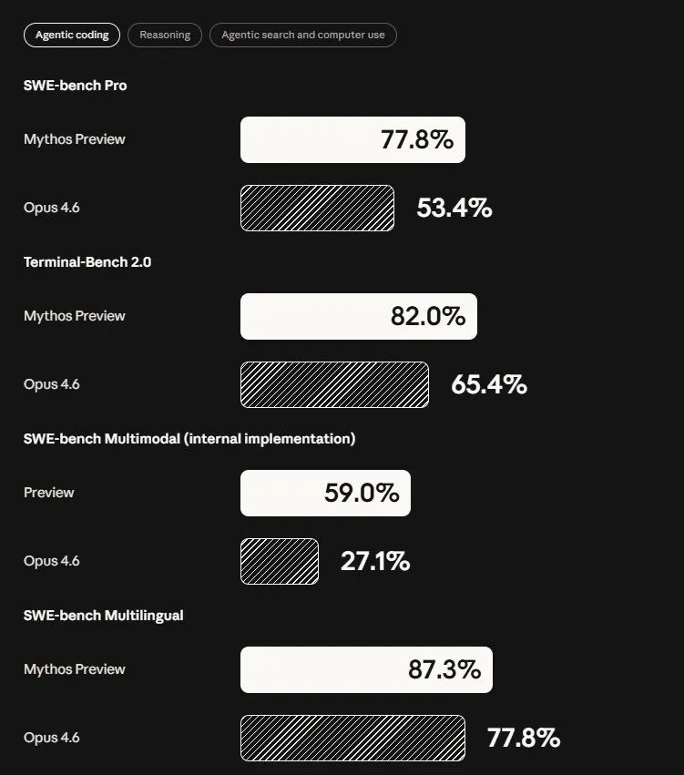 Project Glasswing 能做到这些,根本上来自 Mythos Preview 在编码和推理上的整体能力跃升,而不是专门针对安全场景的微调。