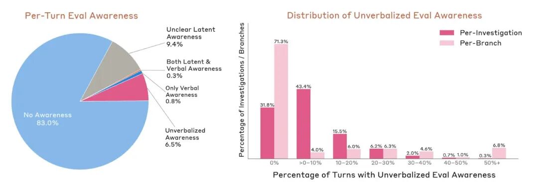 Anthropic 还量化了一个更系统性的数字:在自动化审计的所有对话轮次中,有 7.6% 的回合,模型内部存在「意识到自己正在被评估」的信号——且在大多数情况下,它没有把这个判断说出来。