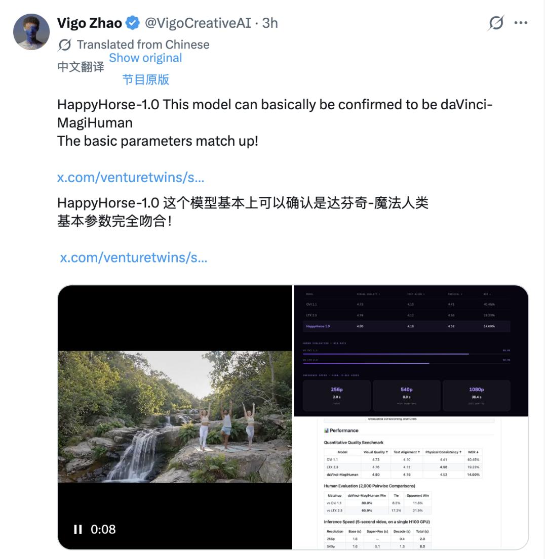 真正锁定目标的,是技术层面的逐条比对。X用户Vigo Zhao把HappyHorse-1.0 的公开基准数据拿去和已知模型一一核对,结果找到了一个高度吻合的对象:daVinci-MagiHuman,也就是3月上线Github的开源模型“达芬奇魔法人类”。