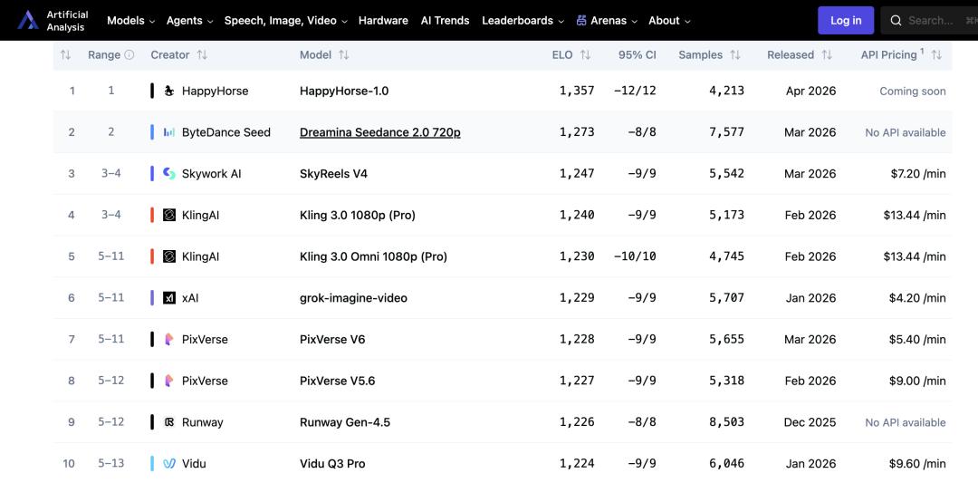 没有发布会,没有技术博客,没有任何公司背书——一款名为HappyHorse-1.0 的文本转视频模型,悄然登顶权威AI评测平台Artificial Analysis的AI Video Arena排行榜,以更高的Elo分数压过了Seedance 2.0,更将可灵、天工等一众主流玩家甩在身后,一时之间引发了技术圈的“解密竞赛”。