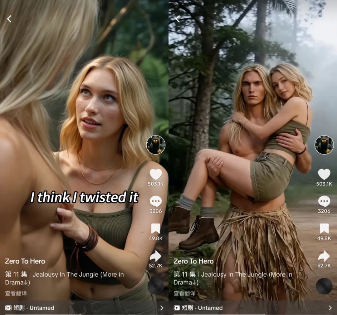 在TikTok上,AI仿真人内容已经跑出相当可观的播放量。一部AI制作的「人猿泰山」改编短剧《Untamed》,站内总观看量超过5亿次。中文在线出品的AI漫剧《愤怒的吸血鬼》在TikTok上线3天播放量即达2.3亿,登陆出海短剧平台Sereal+后付费率高达22%。