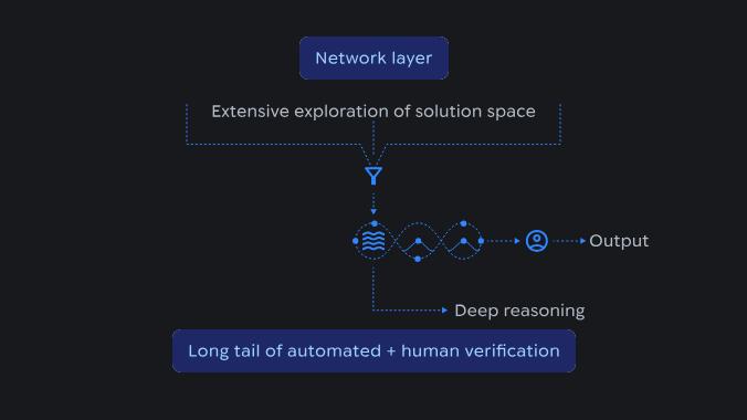 AI推理流程的示意图,展示了在网络层进行的大规模解空间探索如何被汇聚为结构化推理,并通过自动化与人工验证加以确认。