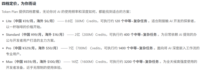 与Coding Plan不同的是,它不再使用以次数为限制的虚无缥缈的承诺,而是像手机流量包的配额制一样,明确告知用户一个周期内套餐中能够使用的token数量。