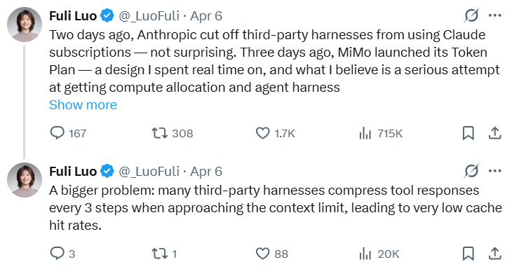 两天之后,小米AI团队的罗福莉发布了一篇关于Mimo Token Plan的推文,批判了当前智能体行业中算力分配的乱象。