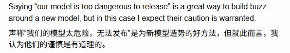 知名开发者 Simon Willison 都出来阴阳怪气,“我们的模型太危险了不能发布”,的确是 AI 圈的流量密码。