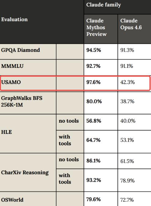 USAMO(美国数学奥林匹克竞赛): 得分从上一代的 42.3% 直接暴涨到 97.6%;