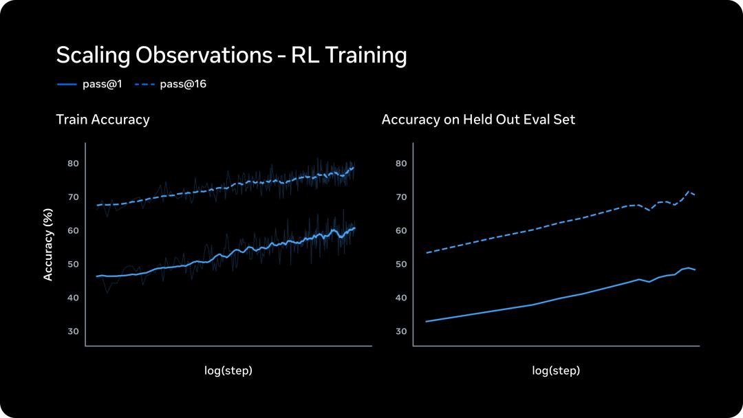 左图是训练集上的表现。pass@1和pass@16(16次尝试中至少对1次)都呈对数线性增长。