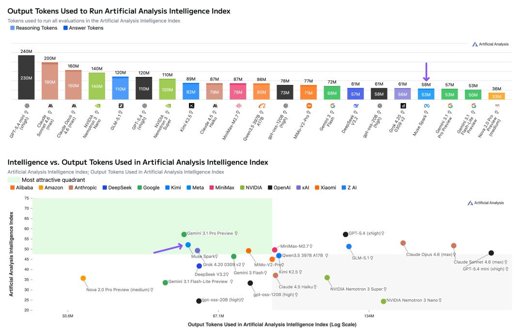 跑完整个Intelligence Index测试套件,Muse Spark用了5800万输出Token,和Gemini 3.1 Pro(5700万)相当,但远低于Opus 4.6(1.57亿)和GPT-5.4(1.2亿)。