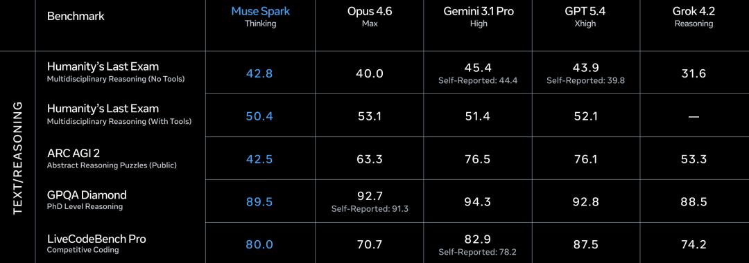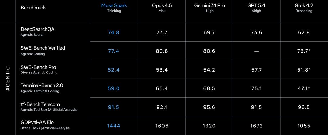 Meta自己也承认了,在代码和长时间Agent任务上,Muse Spark和最强模型还有差距。