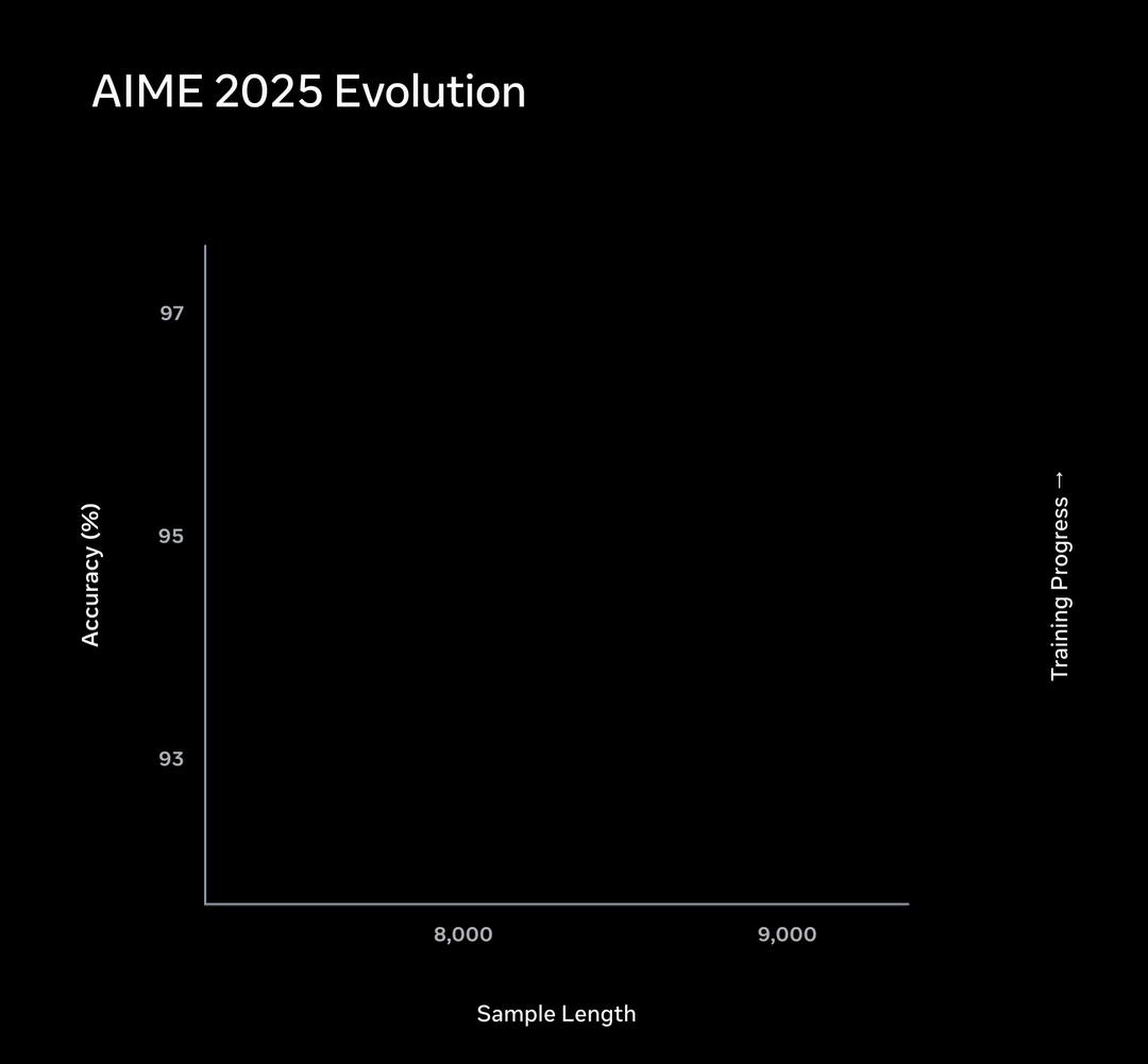 AIME子集上的表现是这样的,训练早期,Muse Spark通过想更久来提升正确率,曲线向右延伸。