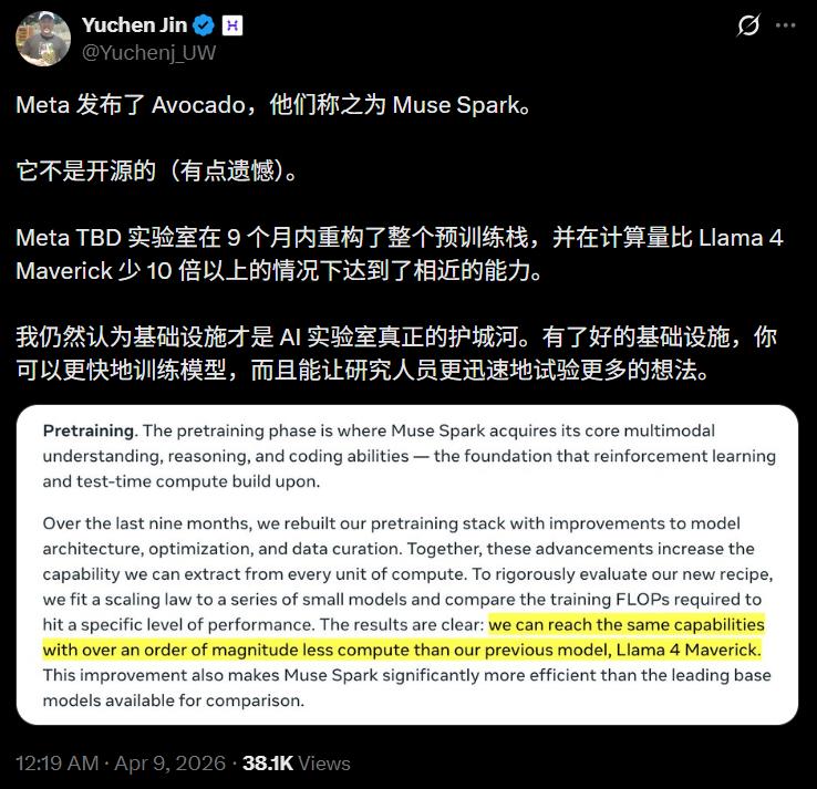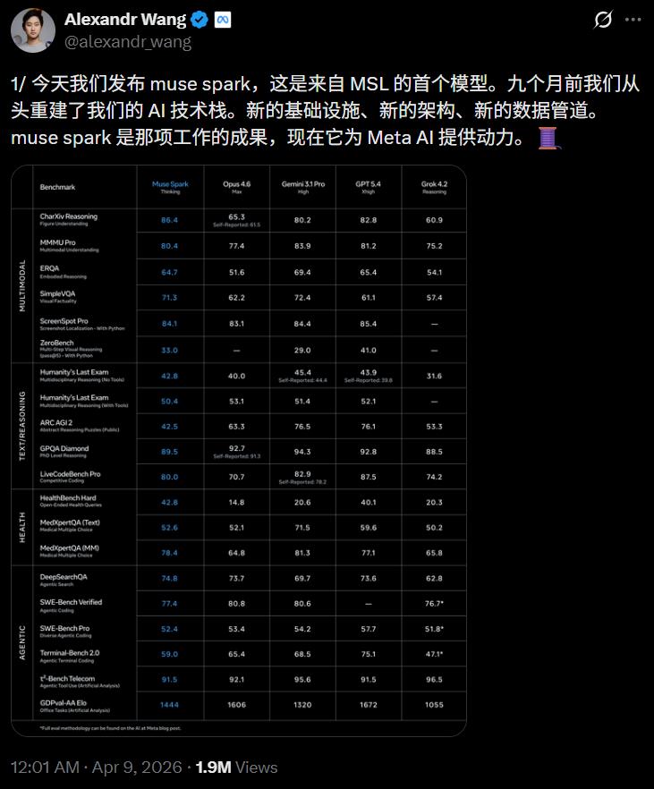 九个月前我们从零重建了整个AI技术栈,新基础设施、新架构、新数据管线。Muse Spark就是这些工作的成果。