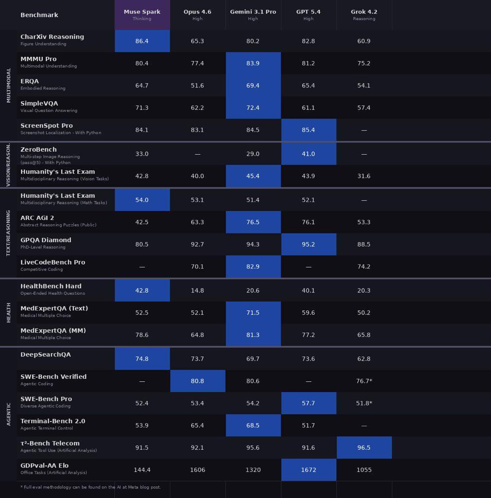 Meta把Muse Spark(Thinking模式)和Opus 4.6、Gemini 3.1 Pro、GPT 5.4、Grok 4.2放在一起比了个遍,覆盖多模态、文本思考、健康、Agent四个维度,总共20多个benchmark。