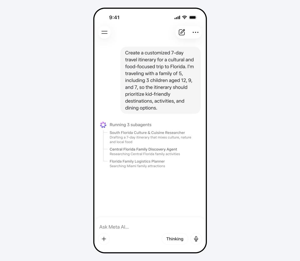 只需输入「帮我规划一个5口之家去佛罗里达的7天文化美食行程,3个孩子分别12、9、7岁」,Muse Spark就会同时派出三个子Agent,一个规划美食文化路线,一个搜索亲子活动,一个协调物流和住宿