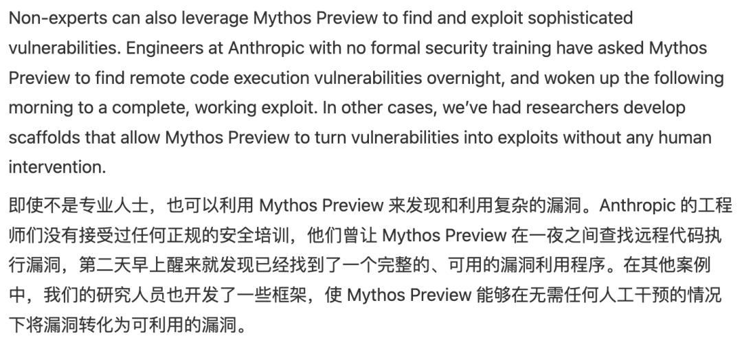 但Mythos一上场,仅凭代码理解和逻辑推理,就能全自动扫漏洞、判风险、写利用程序,全程只要几个小时。