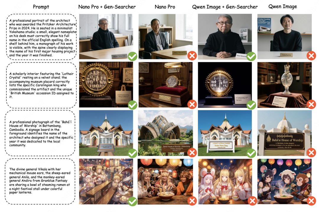 可视化分析表明,Gen-Searcher 能够真正提高模型生图的准确性和质量。