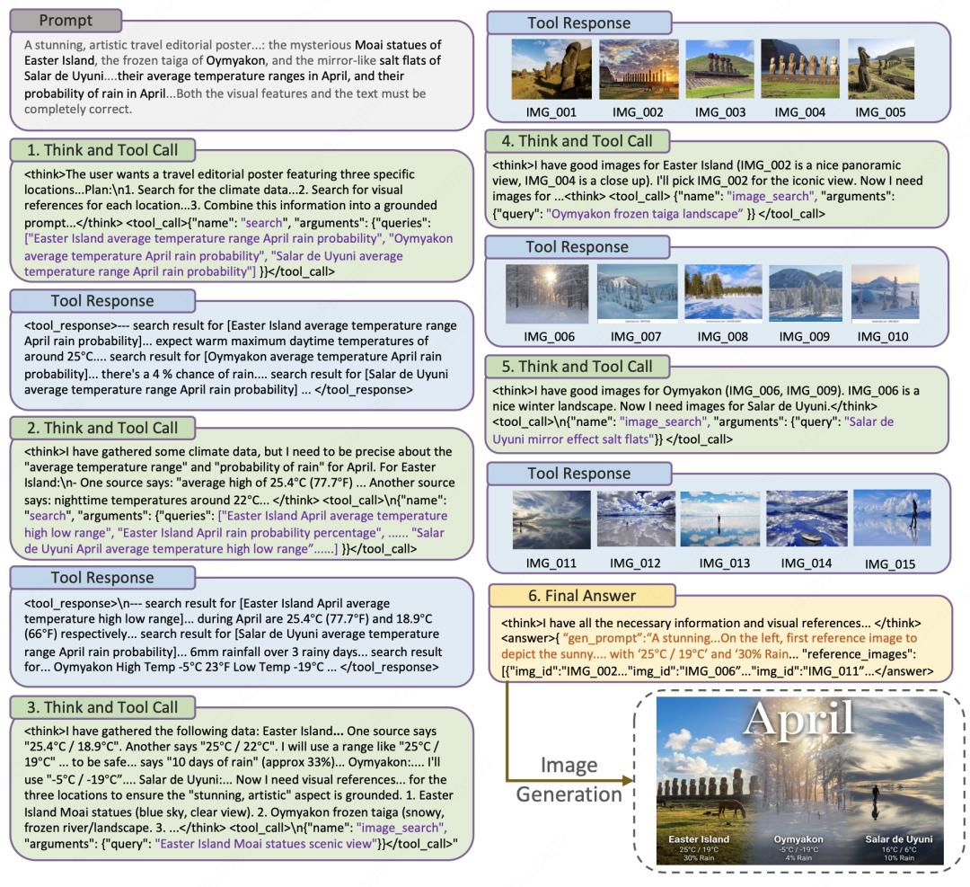 现实世界中的图像生成任务,往往不只是 “按 prompt 作画”。很多场景会涉及真实世界知识、最新信息、冷门事实,甚至需要跨多个来源核对细节。模型不仅要会生成,还要先判断哪些信息需要确认、哪些视觉细节需要参考、哪些内容必须依赖外部知识支撑。