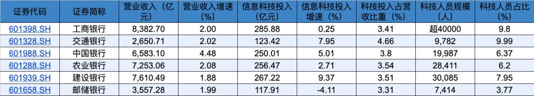 过去一年,工商银行、农业银行、建设银行、中国银行、交通银行、邮储银行等六家国有大行科技投入力度整体进一步强化。