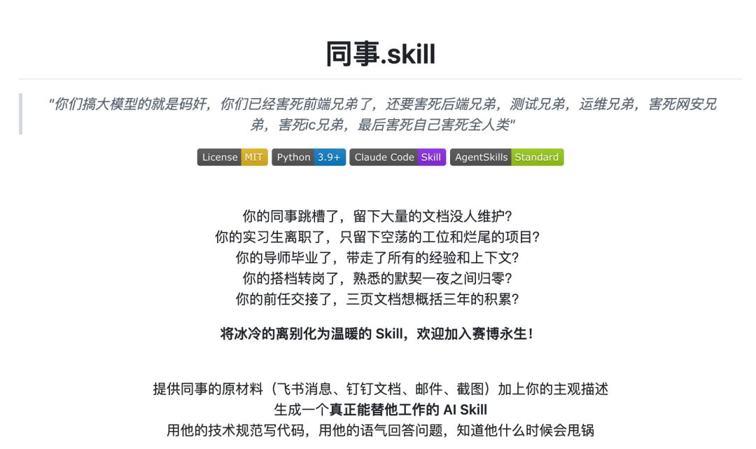 原来,这个本该彻底从公司消失的人,已经被名为“同事.skill”的项目炼化了,他的飞书消息、邮件、工作文档,甚至处理工作的思维模式和方法论,都被喂给AI,变成一个md文件,继续为公司打工。
