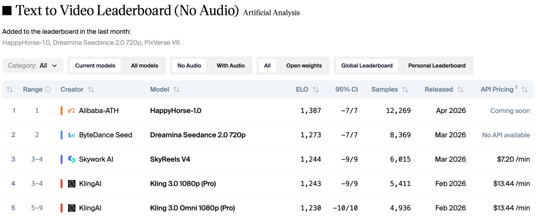AI 评测平台 Artificial Analysis 也在阿里确认这一消息后,在 X 平台迅速发文,表示 HappyHorse-1.0 目前已经在视频竞技场的所有排行榜上都取得了第 1 或第 2 名的好成绩。