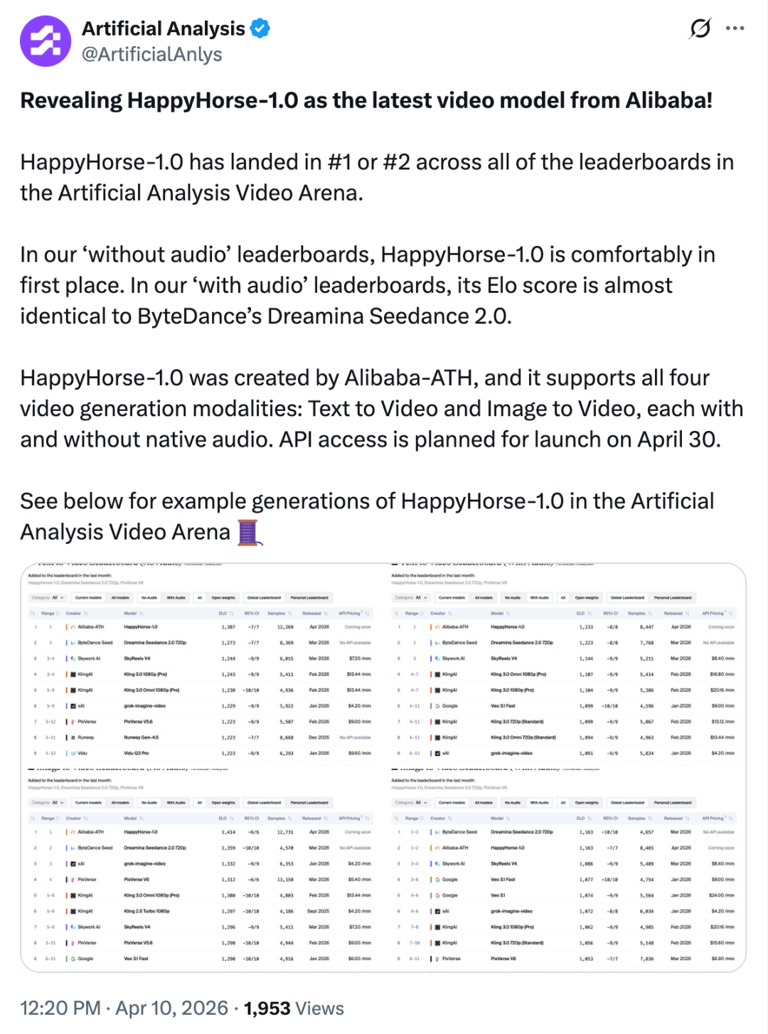Artificial Analysis 还提到 HappyHorse-1.0 支持四种视频生成模式:文本转视频、图像转视频,每种模式均可选择是否添加原生音频,而 API 接口计划于 4 月 30 日开放。