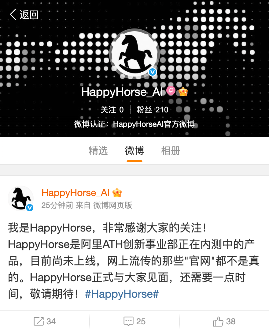 直到今天,HappyHorse 通过官方微博账号 HappyHorse_AI 正式发文,确认是由阿里 ATH 创新事业部研发。