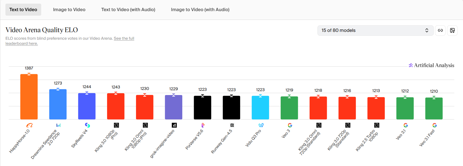 Artificial Analysis视频竞技场的排名核心依据为“人类盲测投票+Elo评分系统”:在同一提示词下,平台随机选取两个模型生成视频,用户仅根据观看体验,投票选择“更好的一段视频”,随后被选中的模型得分,落选的模型失分,并依照分数实时生成排名。根据当前结果,显然国产视频模型在盲测中更受用户偏好。