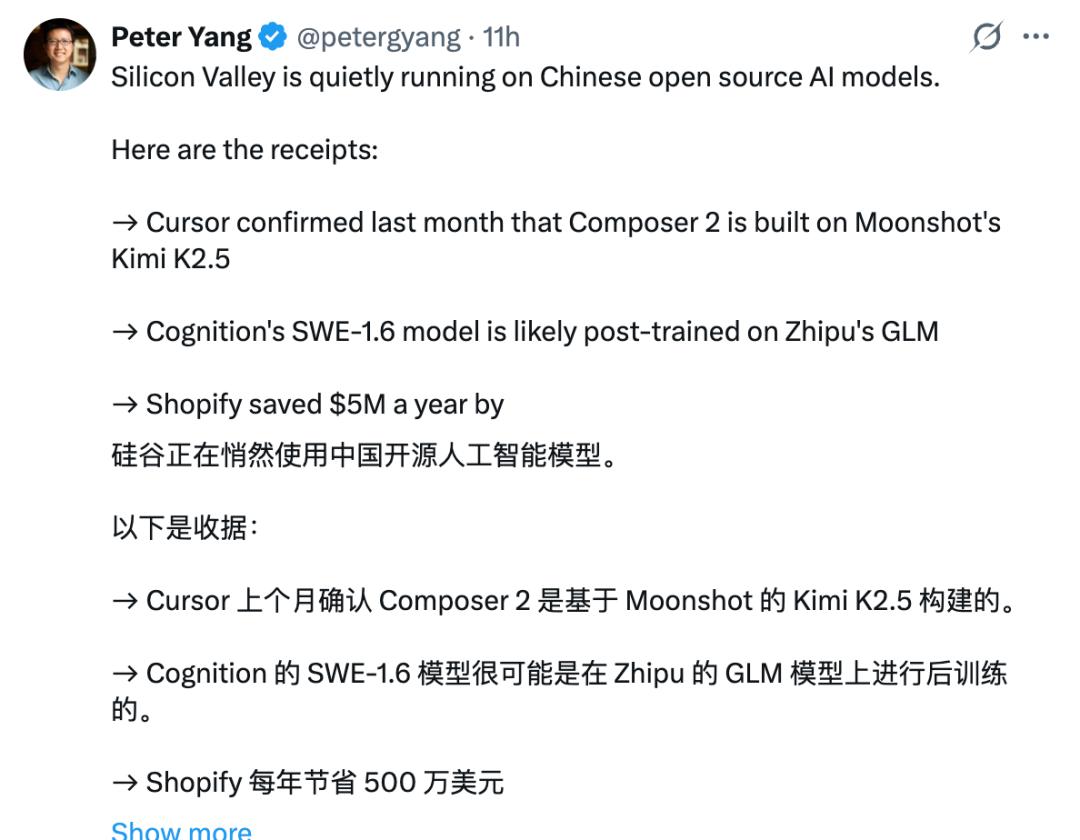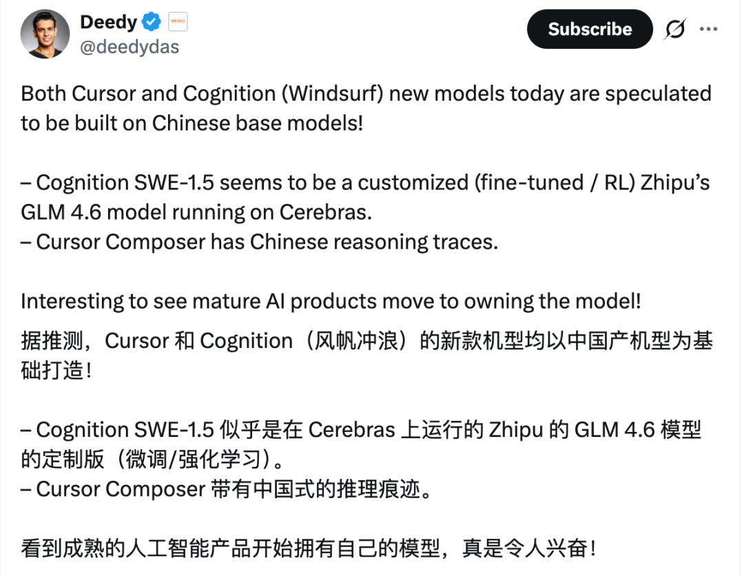 Cursor和Cognition最早集成的都是Claude和GPT的能力,但现在已经纷纷转投中国开源模型的怀抱。