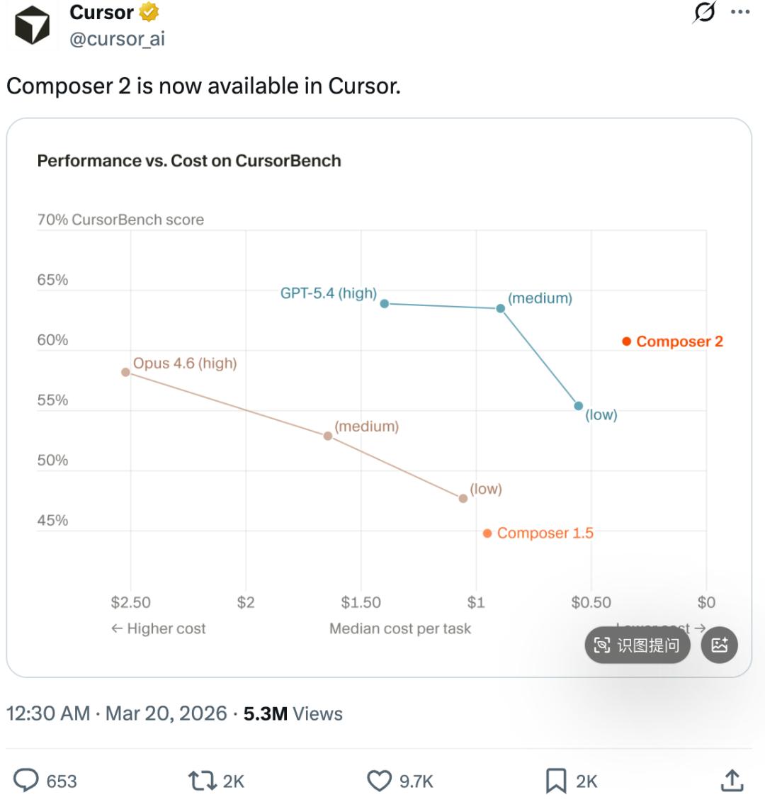 上个月,Cursor的自研模型Composer 2在基准测试上反超了Opus 4.6,价格还脚踝斩。