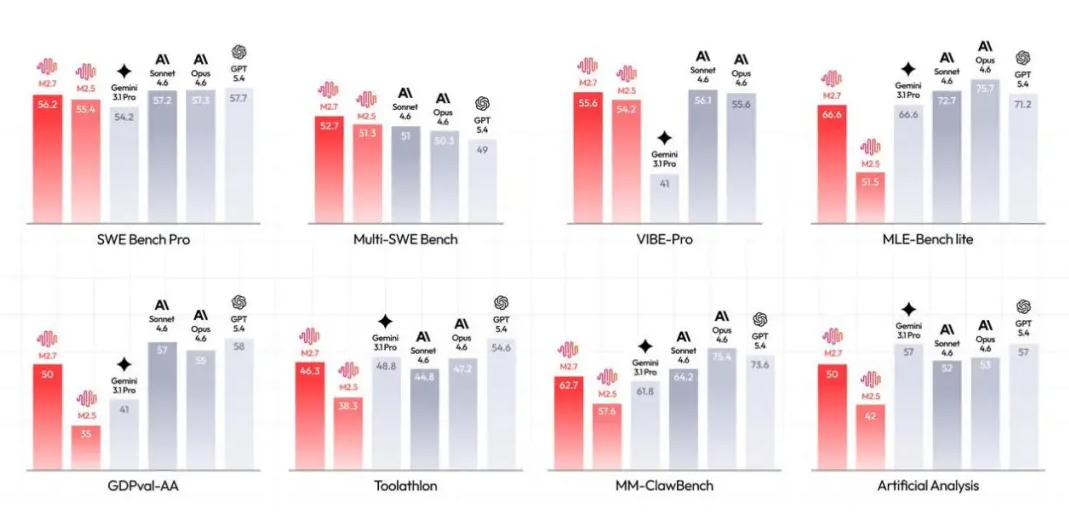 软件工程领域:M2.7 更深入地打磨了真实软件工程所需的编程能力,覆盖日志分析与 Bug 定位、代码重构、代码安全、机器学习、安卓开发等方向。在涵盖多种编程语言的基准测试 SWE-Pro 中 M2.7 以 56.22% 的正确率追平 GPT-5.3-Codex;而在更贴近真实工程场景的 SWE Multilingual(76.5)和 Multi SWE Bench(52.7)中展现出更显著优势。