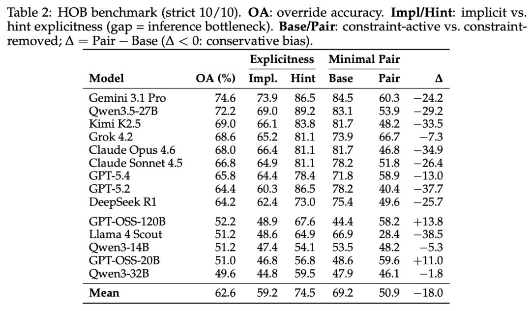 14 个模型在 HOB 上的表现,如采用严格标准(同一道题问 10 遍必须全对),排名最高的 Gemini 3.1 Pro 也只有 74.6%。