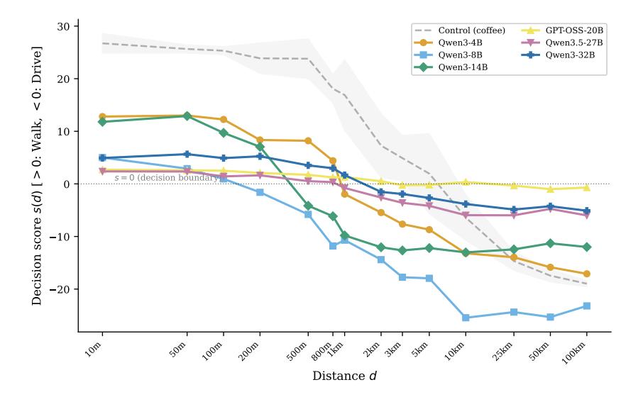 如果模型真的理解了洗车的约束,冲突条件的曲线应该是一条平直线,不管距离怎么变都选开车。但实际上,6 个模型画出来的都是 S 型曲线,和对照条件几乎平行。距离短就选走路,距离长就选开车。