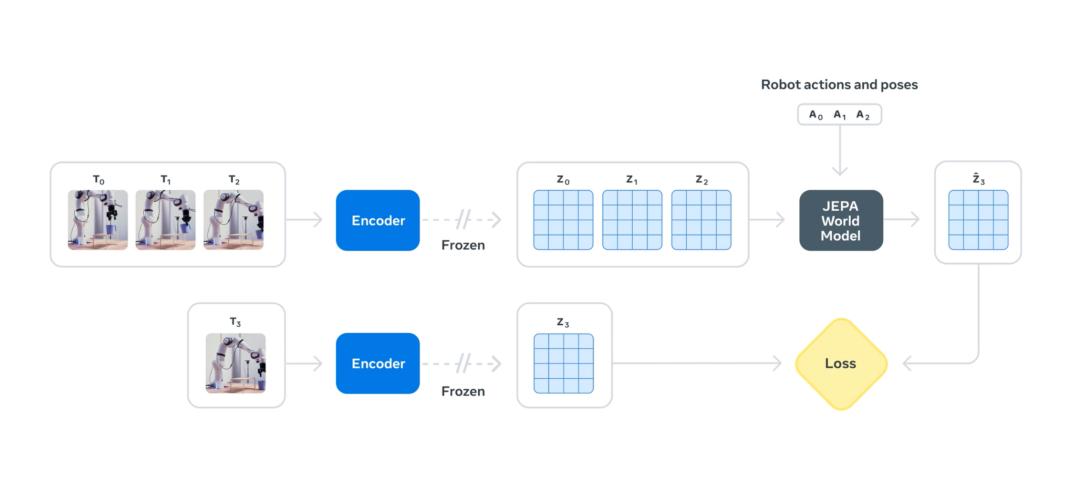 具体做法是先用编码器把视频转成抽象的数学表示,然后在这个空间 (latent space) 里预测「会发生什么」。比如预测「球会滚下桌子」这一更加「长期」和符合物理规律的结果,而非重复地预测球滚落的每一帧画面。