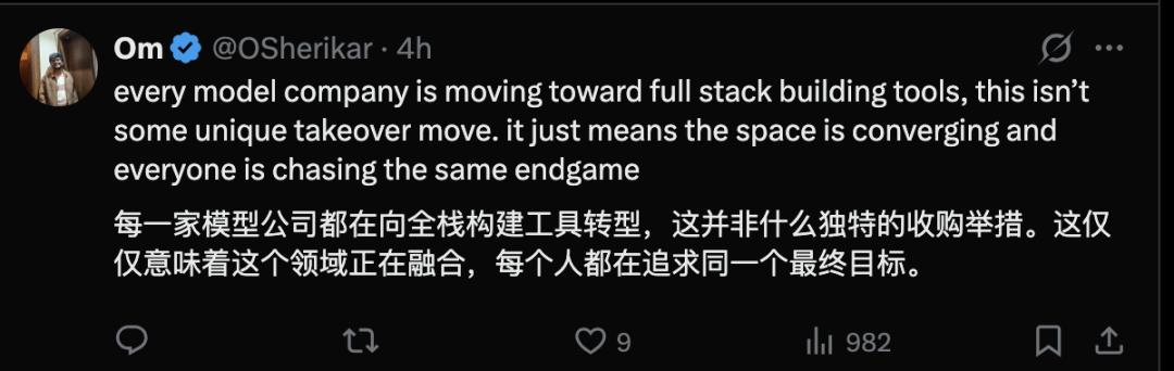 还有用户认为,不止是 Anthropic,其他模型巨头们也在向全栈构建工具转型,这意味着这个领域正在融合,大家都在追求大一统的终极目标。